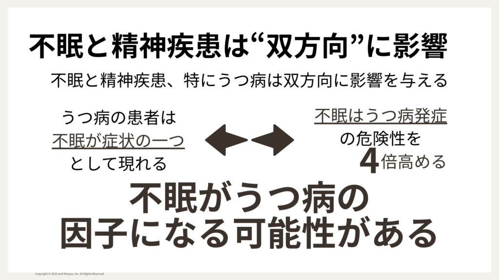 「うつ病になって眠れなくなる」のか、「眠れないからうつ病になる」のか。 かつては前者が一般的と考えられていましたが、近年の研究では、不眠と精神疾患は「双方向」に影響し合うことがわかっています 。