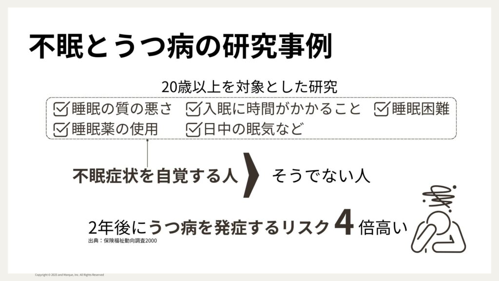 特に注目すべきは、不眠がうつ病の「予兆」であり、かつ強力な「リスク因子」であるという点です。 20歳以上を対象とした調査によると、不眠症状を自覚している人は、そうでない人に比べて2年後にうつ病を発症するリスクが4倍も高いという結果が出ています 。