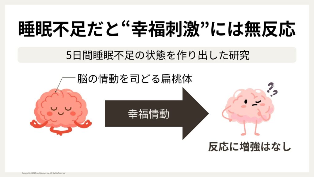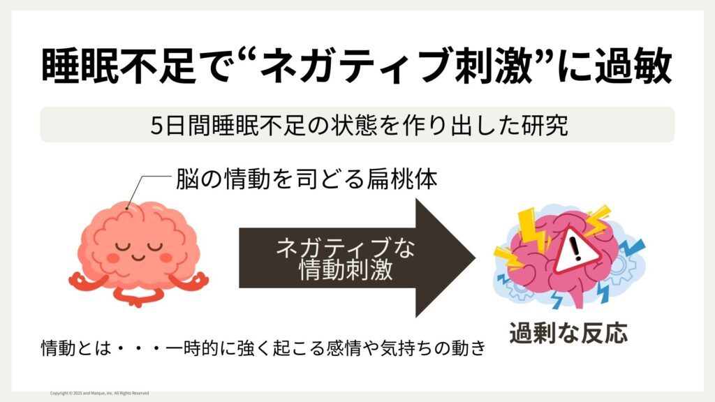 つまり、睡眠不足の脳は「嫌なことには敏感で、楽しいことは感じにくく、イライラを抑えられない」という状態に陥っているのです。これが、メンタル不調の正体の一つです。