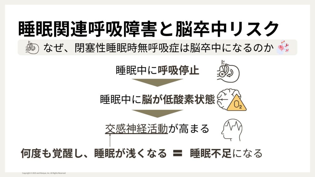 寝ている間に息の通り道が詰まって無呼吸になると 、睡眠中に呼吸が停止し、脳が低酸素状態に陥ります