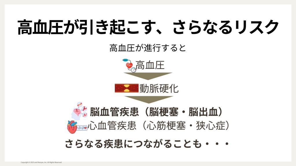 これがさらに進行すると、脳梗塞や脳出血といった脳血管疾患や、心筋梗塞などの心血管疾患につながることがあります