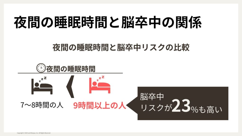 具体的には、睡眠時間が5時間以下の短い場合だけでなく、長時間睡眠の場合も、脳血管疾患のひとつである脳卒中のリスクが高くなります